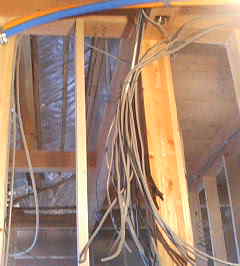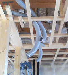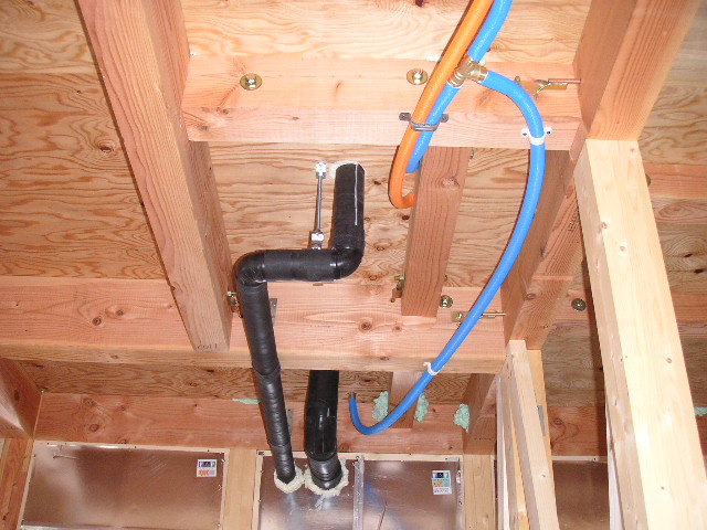 左写真が24時間換気システム右クリック!(松下製)真ん中写真電気配線右写真、右写真換気ダクト。人間で例えると左写真肺、真ん中写真神経伝達、右写真気管ってところです。生命維持に大切物ばかりです。