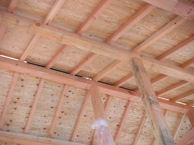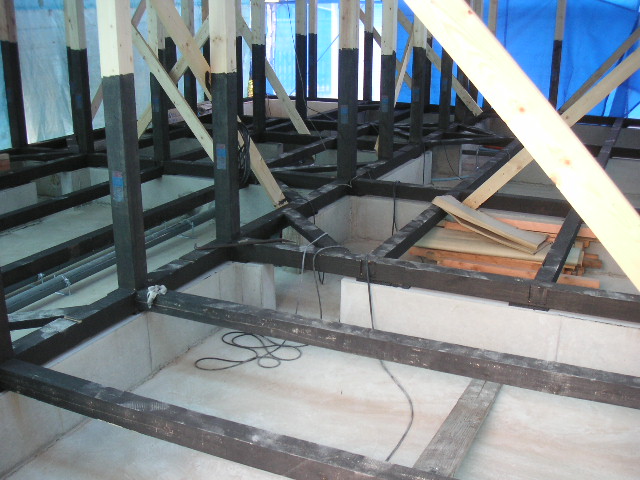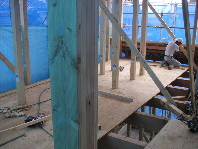 PS・2階構造用合板貼り終わりました。パチンコ玉上から落として転がらないか確認しました。合板全て確認しましたが、1枚も転がりません。2階床が水平である事を確認しました。9/8