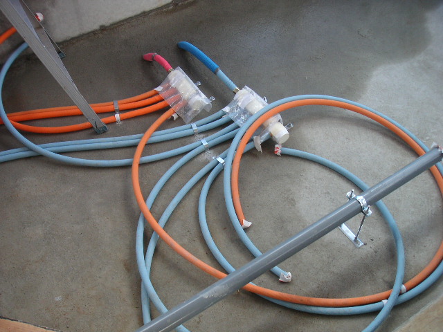 写真左、オレンジがお湯、ブルーが水です。ビニールに包まれた部分がヘダーです。人間の心臓。