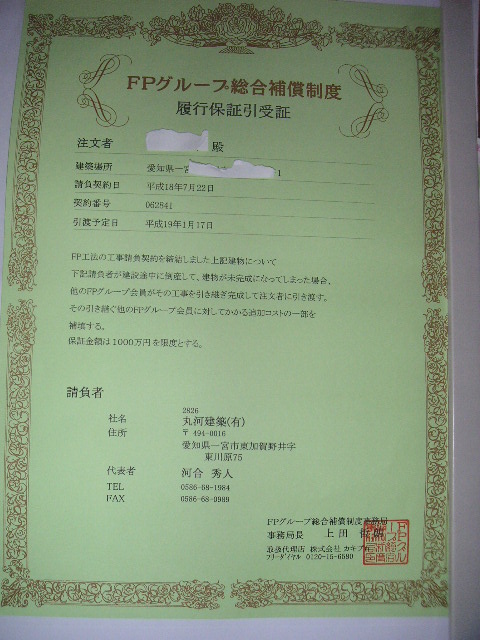 下記クリックして、確認して下さい。「FPグループ総合補償制度・履行保証引受証」