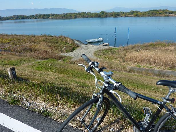 手前がクロスバイク、真ん中付近の船は、地元の隠れた名所「中野渡し」です。